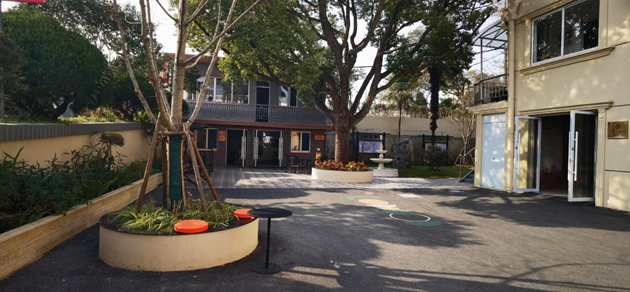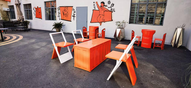 百年白玉兰树下橙色桌椅错落